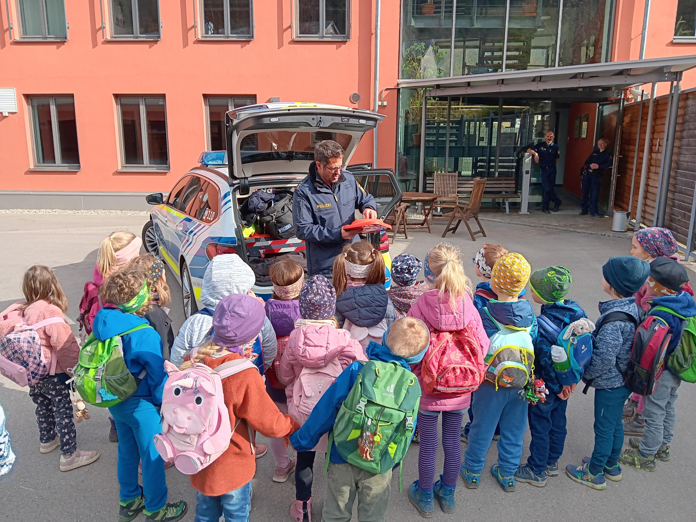 Auch dieses Jahr besuchten unsere Raketenkinder die Polizei in Immenstadt. Zuerst ging es auf die Straße, damit alle Kinder nochmal hörten und übten, wie man am sichersten über die Straße geht. Nach einem „Besuch“ im Gefängnis und einer stärkenden Brotzeit durften die Kinder noch das Polizeiauto anschauen und auch den Alarm einschalten. Es war ein toller Ausflug mit einer gelungenen Busfahrt. Vielen Dank an Herr Schlachter für die tolle und kindgerechte Darbietung.